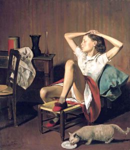 Balthus Klossowski de Rola es conocido como Balthus a secas, nació en París en 1908 y falleció en Suiza en el 2001. Algún viaje a Italia le permitió enamorarse de Piero della Francesca y Masaccio, donde debemos ver el origen de su arte. El escándalo ha estado presente en cada una de sus muestras, algunos han visto pedofilia y situaciones equívocas en sus jóvenes modelos. Ahora podemos ver esta obra en Basilea en la retrospectiva con 40 de sus obras que se realiza hasta fin de año en la Fundación Beyeler, uno de los museos más bellos del mundo.